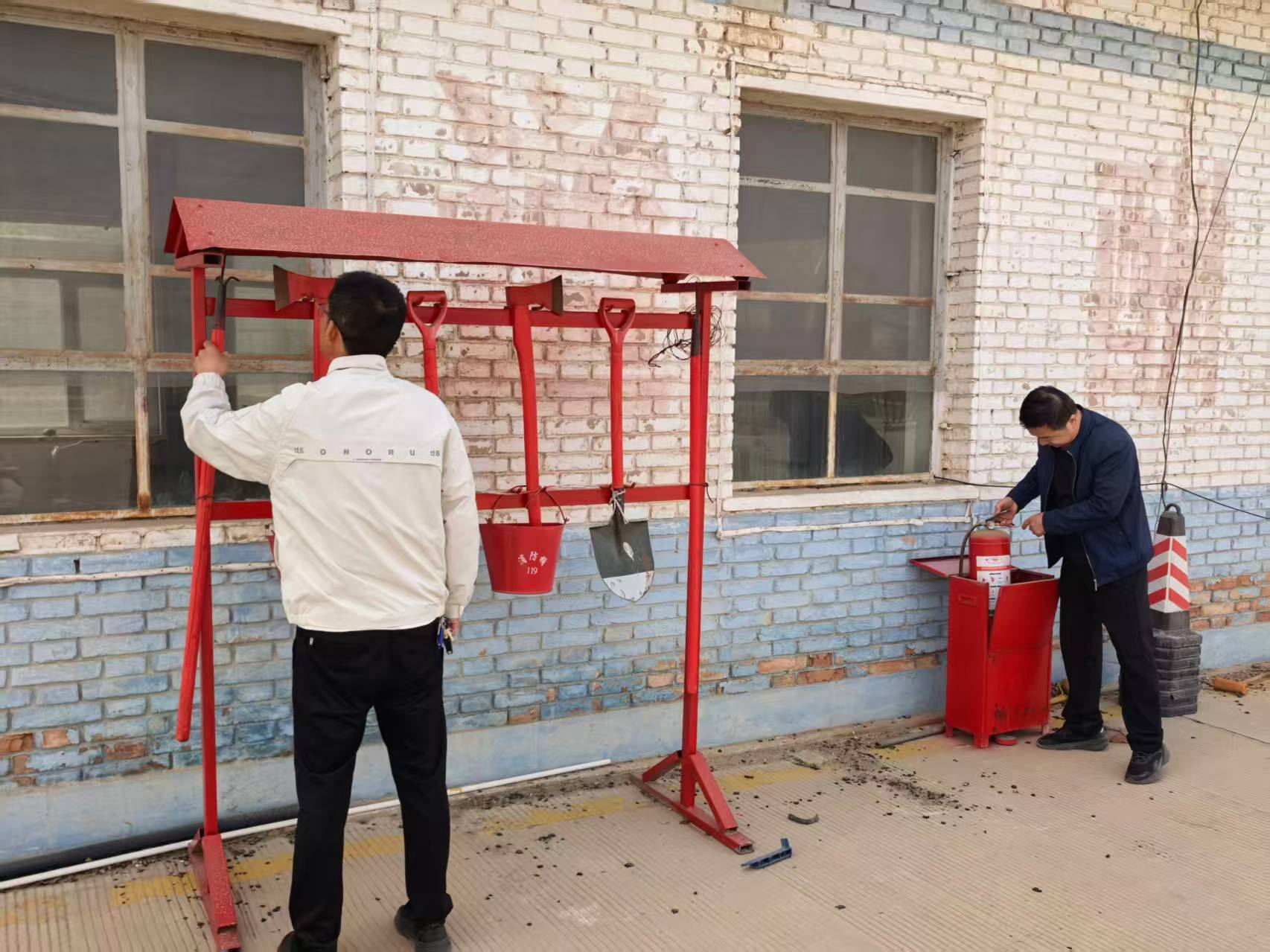 (工作人员实地检查消防器材配置)
