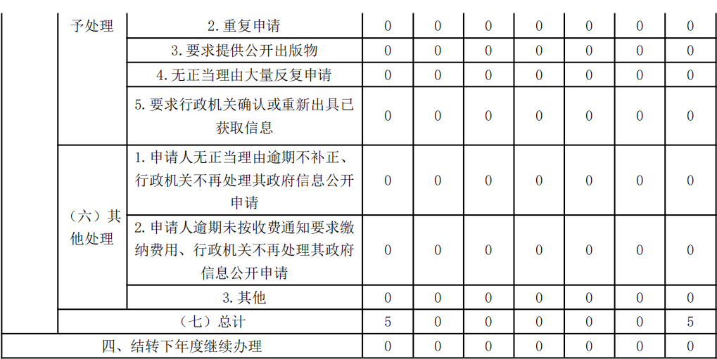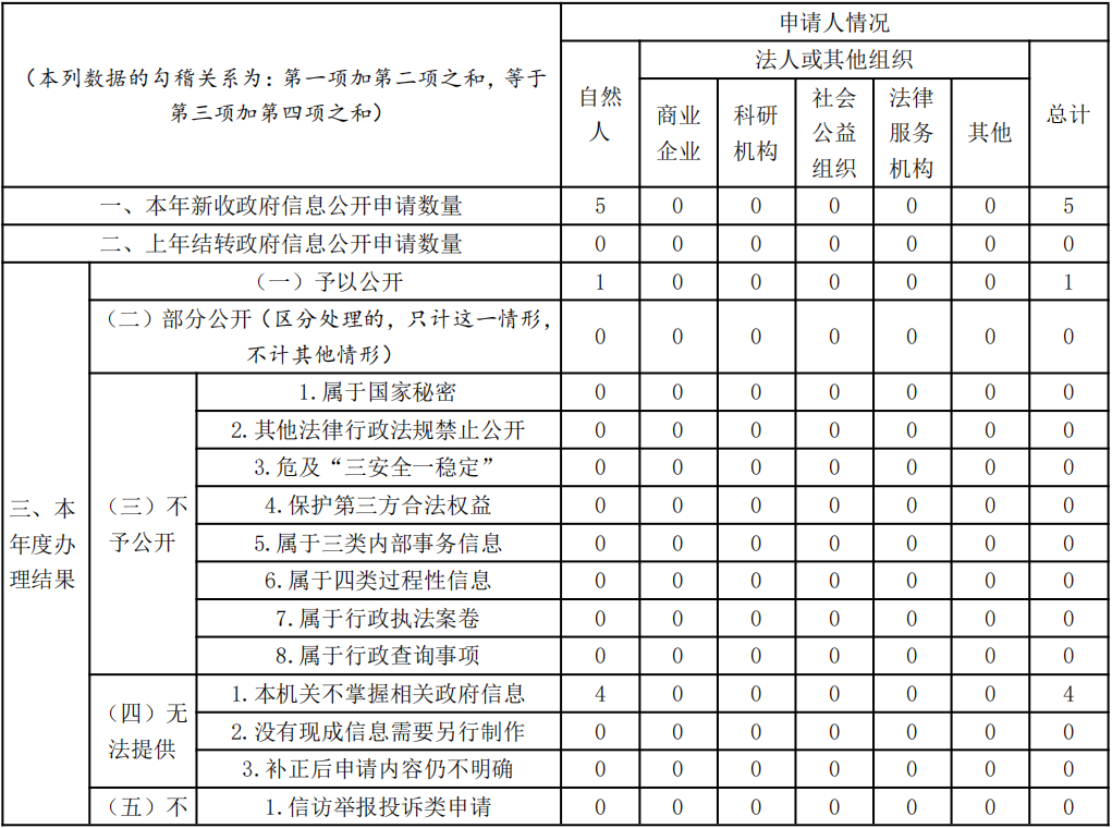 2025年度共受理政府信息公开申请5件,已全部办结。其中予以公开1条,不掌握相关政府信息4条。